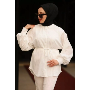 KADIN Krem Balon Kol - Belden Bağcıklı Lara Kumaş İkili Takım lr4545
