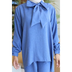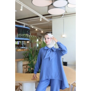 KADIN MAVİ FİYONKLU SOFYA KETEN İKİLİ TAKIM