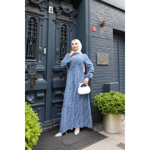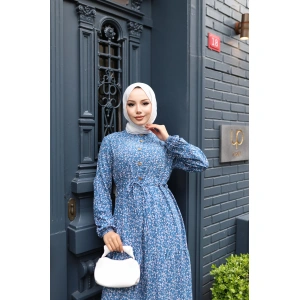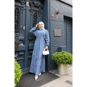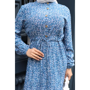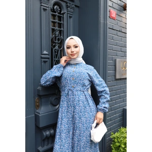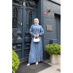 KADIN Mavi %100 Viskon Pamuklu Belden Bağlamalı Gül Desen-Kat Kat Tesettür Elbise Gd125