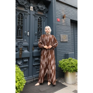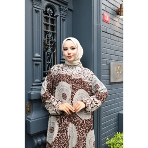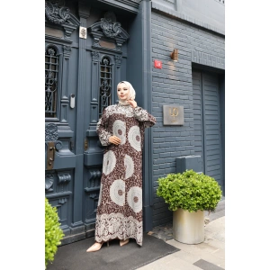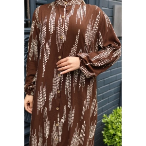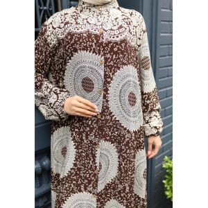 KADIN Kahverengi %100 Viskon Pamuklu Boydan Düğmeli Etnik Desen Bol Kesim Tesettür Elbise E743