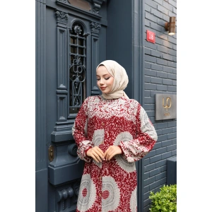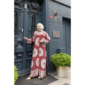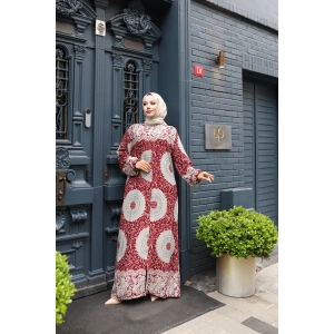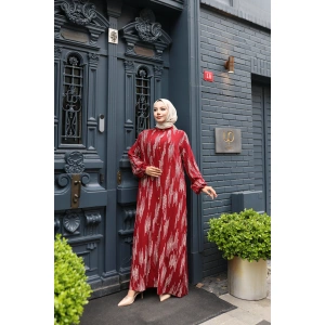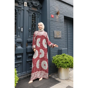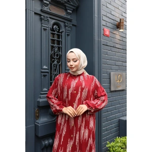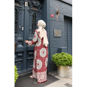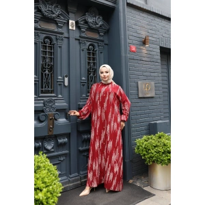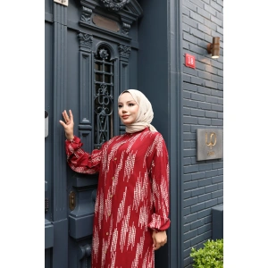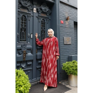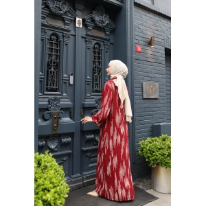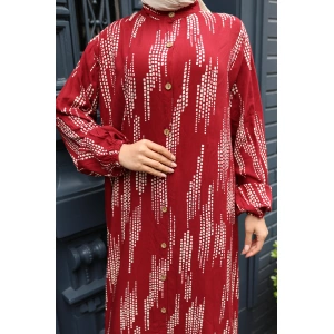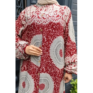 KADIN Kırmızı %100 Viskon Pamuklu Boydan Düğmeli Etnik Desen Bol Kesim Tesettür Elbise E744
