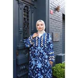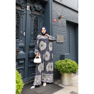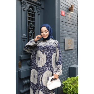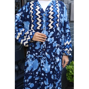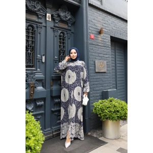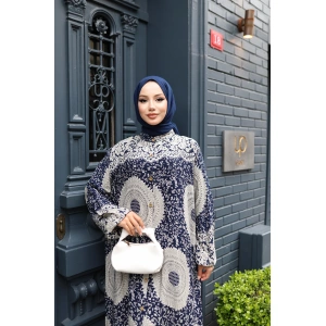 KADIN Lacivert %100 Viskon Pamuklu Boydan Düğmeli Etnik Desen Bol Kesim Tesettür Elbise E741