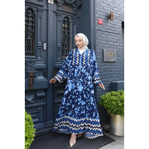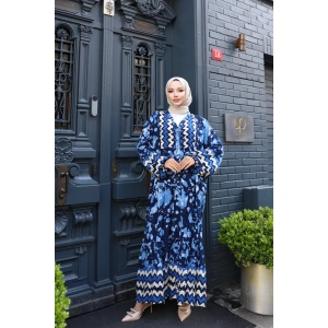 KADIN Lacivert %100 Viskon Pamuklu Belden Kuşaklı-Etnik Desen Bol Kesim Tesettür Elbise E476