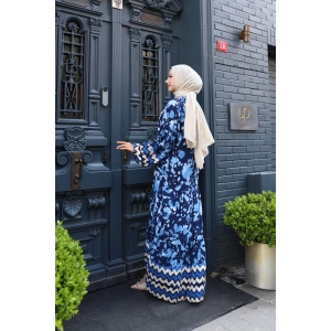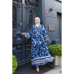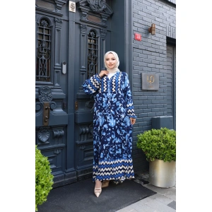KADIN Mavi %100 Viskon Pamuklu Belden Kuşaklı-Etnik Desen Bol Kesim Tesettür Elbise E479