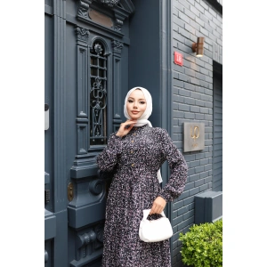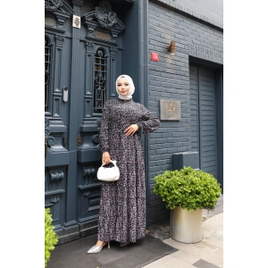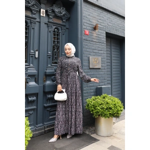 KADIN Siyah %100 Viskon Pamuklu Belden Bağlamalı Gül Desen-Kat Kat Tesettür Elbise Gd124