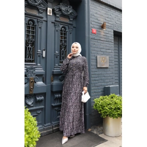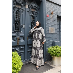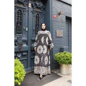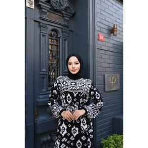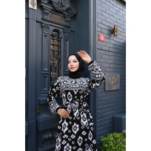 KADIN Siyah %100 Viskon Pamuklu Belden Kuşaklı-Etnik Desen Bol Kesim Tesettür Elbise E475