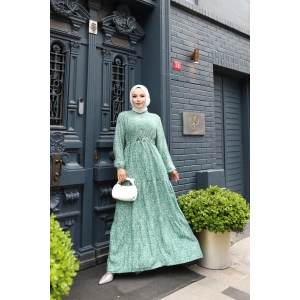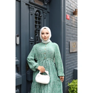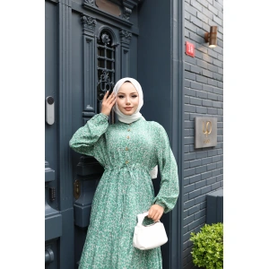 KADIN Yeşil %100 Viskon Pamuklu Belden Bağlamalı Gül Desen-Kat Kat Tesettür Elbise Gd123