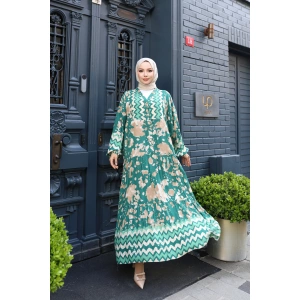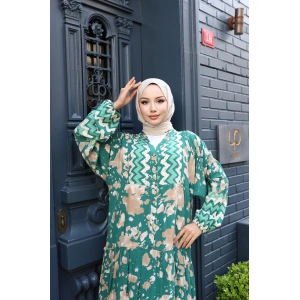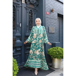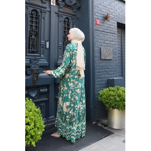KADIN Yeşil %100 Viskon Pamuklu Belden Kuşaklı-Etnik Desen Bol Kesim Tesettür Elbise E478